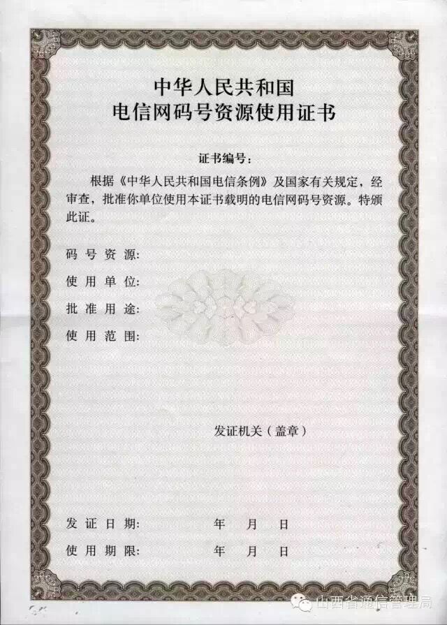 我部將于通告公布之日起正式啟用《電信網(wǎng)碼號(hào)資源使用證書(shū)》。此前,我部已發(fā)電信網(wǎng)號(hào)碼使用批復(fù)文件、《短消息類服務(wù)接入代碼使用證書(shū)》,在使用期限內(nèi)繼續(xù)有效。
