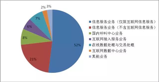 按照2015版《電信業(yè)務(wù)分類目錄》中增值電信業(yè)務(wù)分類, 45941家增值電信企業(yè)合計(jì)擁有56428個(gè)許可項(xiàng)目。其中,29353個(gè)信息服務(wù)業(yè)務(wù)(僅限互聯(lián)網(wǎng)信息服務(wù)),11929個(gè)信息服務(wù)業(yè)務(wù)(不含互聯(lián)網(wǎng)信息服務(wù)),4627個(gè)國(guó)內(nèi)呼叫中心業(yè)務(wù),4210個(gè)在線數(shù)據(jù)處理與交易處理業(yè)務(wù),3360個(gè)互聯(lián)網(wǎng)接入服務(wù)業(yè)務(wù)(以下簡(jiǎn)稱ISP),1391個(gè)互聯(lián)網(wǎng)數(shù)據(jù)中心業(yè)務(wù)(以下簡(jiǎn)稱IDC),其他業(yè)務(wù)1558個(gè)。