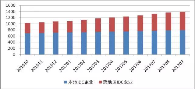 截至2017年9月底,全國(guó)IDC持證企業(yè)共1391家,其中工業(yè)和信息化部許可的跨地區(qū)企業(yè)596家,各省(區(qū)、市)通信管理局許可的本地企業(yè)合計(jì)795家,較上一月分別增長(zhǎng)1.90%、3.47%、0.76%。