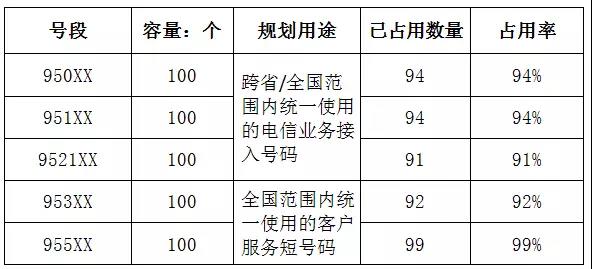 經(jīng)統(tǒng)計(jì),截止2017年9月30日,950XX/951XX號(hào)段已占用號(hào)碼數(shù)量188個(gè),號(hào)段占用率94%;9521XX號(hào)段已占用號(hào)碼數(shù)量91個(gè),號(hào)段占用率91%;953XX/955XX號(hào)段已占用號(hào)碼數(shù)量191個(gè),號(hào)段占用率95.5%。(詳見表1)。