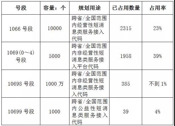 根據(jù)《電信網(wǎng)編號(hào)計(jì)劃(2017年版)》中“106號(hào)段的具體規(guī)劃”,目前工信部已啟用1066號(hào)段、1069(0~4)號(hào)段、10698號(hào)段、10699號(hào)段四類跨地區(qū)短消息接入代碼供各類單位申請(qǐng)使用。
